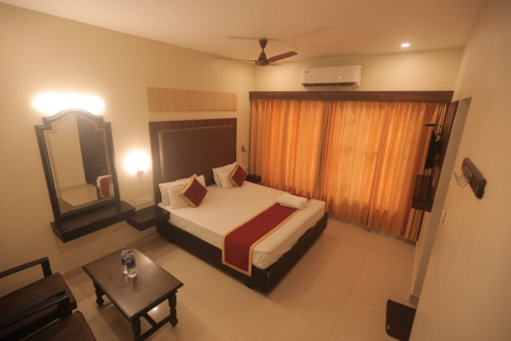 The Deluxe Room at Hotel Sridevi are crafted to suit the cultivated tastes of urban travelers. This standard room with a double bed consists of painted walls, decorations, furniture, and an overall atmosphere designed to suit all ages. Bathrooms have closets and western showers. The rest of the features include a large dressing table with mirrors, chairs, and LED TV. In addition to air conditioning and carpeting, the luxurious standard room has a king-size bed. This room is perfect for travel partners and colleagues or for meetings and conferences.